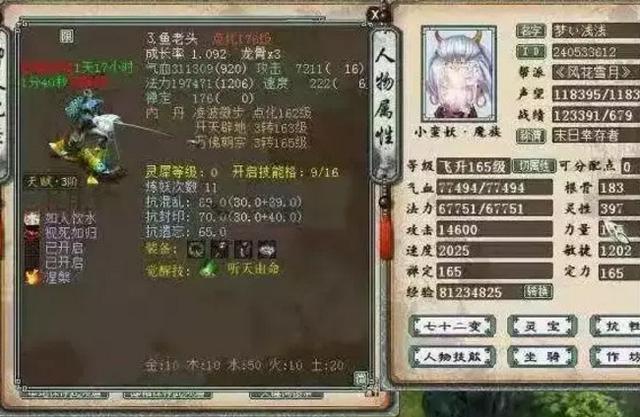 一只点化176级的神兽垂云叟,技能一般,就一个内丹,不过神兽始终是神兽,数据美滋滋。