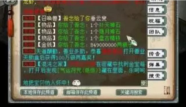 这位玩家在春节任务中没有得到什么好奖励,虽然任务延长了,依然没有被几率。在世界看到一位玩家卖垂云叟,想起了自己十多年的神兽梦,就赶紧凑钱了。8.49亿+一个补天+一个盘古+一个银月神石,就要得到心爱的神兽了。