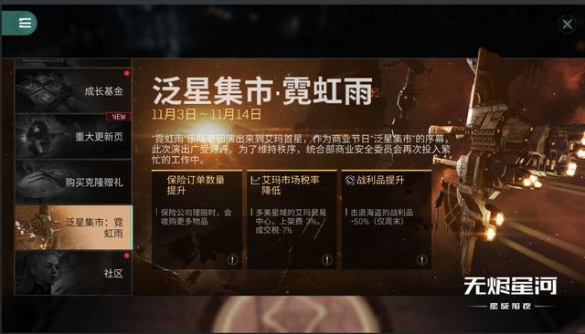 全民狂欢盛宴,泛星集市开启随着八大旗舰的降临,新伊甸的狂欢盛宴也同步开启,属于新伊甸各位飞行员的不眠夜就要来了!奔腾的潮汐,动感的音乐,将热血与激情一步步带向高潮,诸位请尽情享受狂欢吧!
