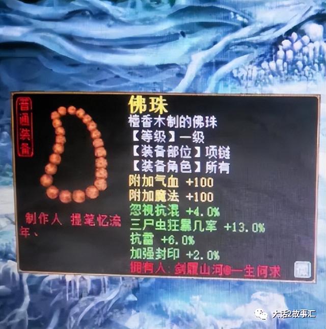 底子是附加气血魔法100,很有纪念意义的装备,炼化效果是忽视抗混加4,加强封印加2,抗雷加6。虽然炼化的忽视混属性非常厉害,但是如果是在四上区这条项链价格就不会那么贵了,在新区这样的项链也是天价。