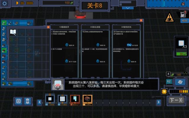 在达到一定难度后游戏在第一个boss关后每三关会出现一个系统插件的选择,系统插件一般有着正负两个效果,而其效果也会因为游戏的进程有着显著的改变,比如当玩家有着很强范围伤害能力时完全不用担心选到怪物数量增加,反之则万万不可选。每次出现的系统插件有三个,当然也是随机的,玩家可以选择其中的0-3个,是的可以不选,笔者目前的策略基本就是除了短期有效的负面效果之外不选其他插件,因为就目前的体验来看系统差价你的负面效果影响还是很大的。