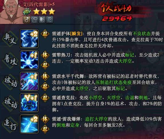 突破雷影的出现直接终结了四尾 小金人 土主一类的叠盾流,让你盾再多,我每回合四个拳头过去,照样1打4不带歇菜的。虽然目前出现了很多克制雷影的阵容,但是依旧属于目前日常 仙界必备的阵容,也几乎属于必洗且必洗完全毕业的忍者。
