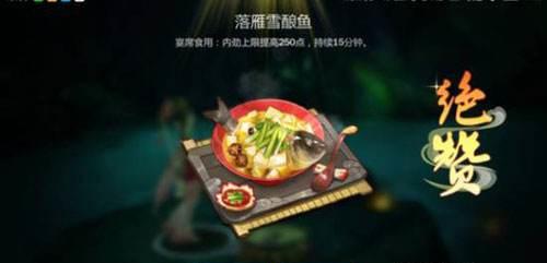 落雁雪酿鱼:使用煮锅,依次放入泉水、鱼、菜、豆腐。宴席食用效果内劲上限提高250点。