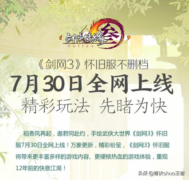 哈喽大家好,我是你们的老朋友青袂君。本期青袂君要给各位读者朋友们带来的游戏资讯是有关于“剑网三怀旧服开服,多种模式白嫖就能玩,江湖盛景等你来探!”