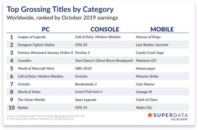 SuperData榜单的手游营收TOP10