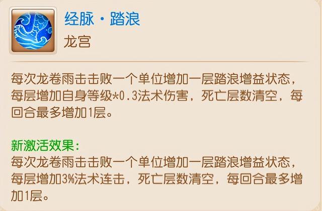 在本次调整中,踏浪经脉由每层提升法伤改为了每层提升3%法连概率,一旦踏浪经脉来到5层,龙卷法连概率将成倍提升,直接来到29%的超高概率。