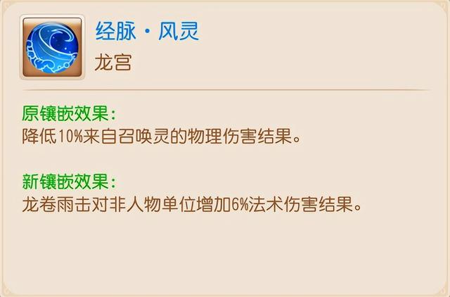 尤其是风灵经脉镶嵌效果中“龙卷雨击对非人物单位增加6%法术伤害结果”的调整,更是让PVE环境下的龙宫得到了前所未有的巨大提升。要知道PVE环境下的所有怪物可都是非人物单位,这个调整等于是直接给予了龙宫一个永久“小凤舞”的加强。