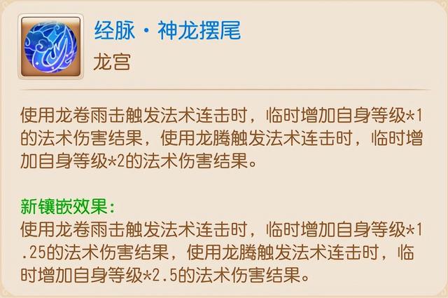 在此前版本,对于追求简易装备的精锐和勇武玩家来说,龙宫的龙卷雨击法连概率几乎是一个固定数值,这一固定数值便是神龙摆尾经脉带来的10%的法术连击概率。