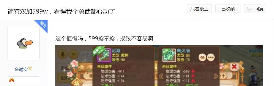 比如这位网友,所晒出的是一把70级简易北斗七星剑,虽然569点的物理伤害属性并没有楼主晒出的武器属性高,但在绿字属性方面却有不小的优势,有着48点力耐属性加成,同时携带了罗汉金钟特技,整体看下来与楼主晒出的武器不相上下。根据这名网友提供的信息来看,在购买时花费了800万金币。