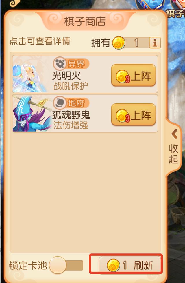 每轮将会自动刷新商店,少侠可以锁定商店,在下轮开始时不会自动进行刷新,当然也可以消耗1点召唤灵能量主动进行刷新