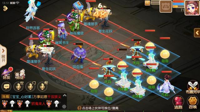 战斗过程中注意,泡泡错位摆放,满血泡泡适当扛伤,及时替换残血泡泡。天兵摆放位置靠前排,同一列后排摆放启明星。适当使用虾兵,放在前排扛伤。