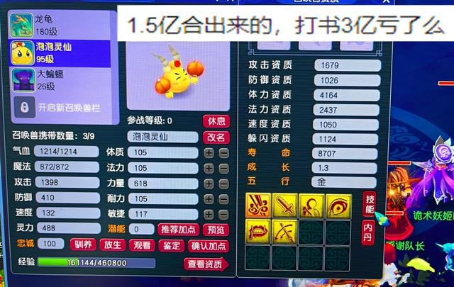 上面的这只召唤兽绝对是梦幻中有钱玩家的代表。上面的这只召唤兽绝对是梦幻中有钱玩家的代表,上面的这位玩家为了这一只6技能的召唤兽付出了4.5亿的成本,这位玩家打造出来的是一只6技能的泡泡灵仙,现在已经打成了全红,成长达到了1.3,攻击资质资质也非常的不错,还可以再继续吃元宵来提升攻击资质,最高能够提升到1700多呢。