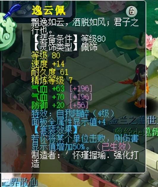 后排灵饰就比较常规,配置了两件80级装备,下排附加的都是双气血一防御的属性,所有灵饰装备都是精炼了7级星辉石,点化了4级自我陶醉特效。