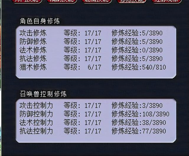 人物修炼以及辅助技能的详情是这样的,109级满修炼为17级,目前该角色的四个人物修炼都达到了17级,宝宝修炼四个同样也是满级的。辅助技能方面,满129级的强身术以及36的神速技能,同时还有其它的生活辅助技能。总体来说,这个号的底子是很让人满意的,该满级的都满了。