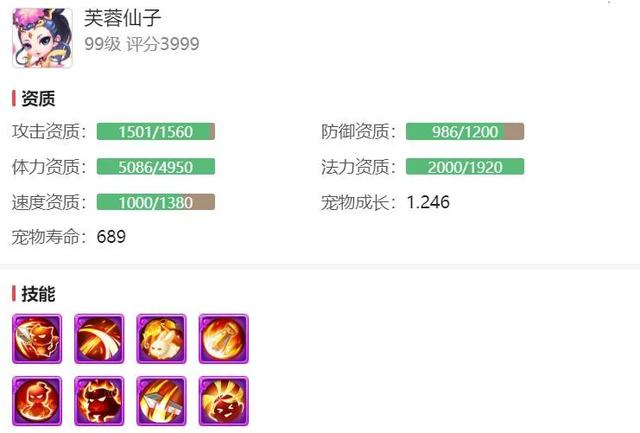 在宝宝方面,主力攻宠是一只8技能全红的芙蓉仙子。资质比较不错,攻击资质1501,防御资质986,体力资质5086,同时还有1.246的较高成长值。