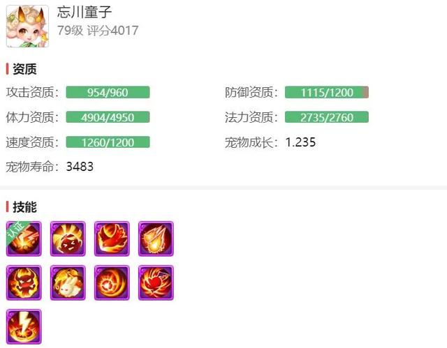 而法宠方面,比较亮眼是一只认证9技能全红的忘川童子,法力资质2735,体力资质4904,防御资质1115,这三项资质距离满属性的差距都不算大,搭配上1.235的成长值,整体属性非常出色!