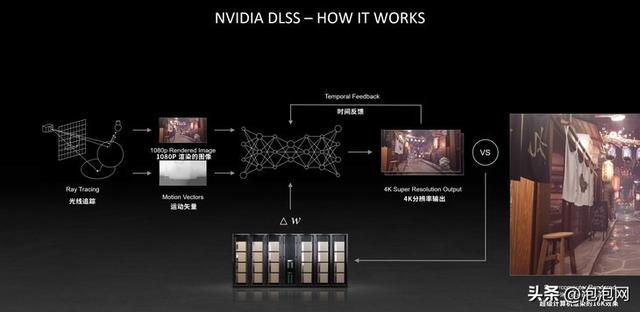 DLSS(深度学习超采样),是NVIDIA所推出先进的图形技术,通过神经网络的计算单元Tensor Core硬件加速的深度学习对实时渲染的图片实现非常高质量的超分辨率,从而大幅提升游戏渲染的性能。这项技术在RTX 20系的图灵架构当中首次使用,原理是在超级计算机当中以极低的帧率和每像素64个样本对数万张高分辨率的图像进行渲染,训练出深度神经网络,将较低分辨率的图像输入,“脑补”成高分辨率的图像。因此可以在不降低画质的前提下,大幅提升游戏的帧率。