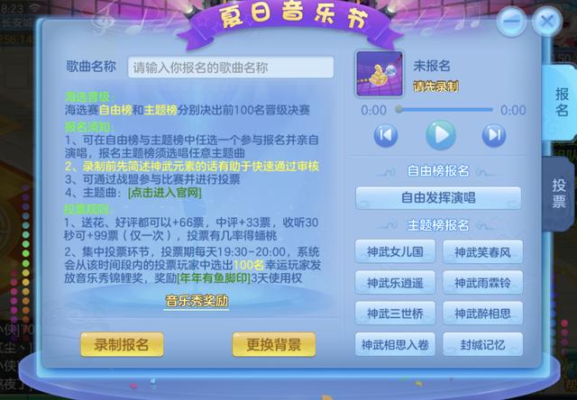 3.神武好声音可以找杨贵妃报名,类似之前的选美大赛,所有玩家作为全民导师都可以给你的作品投票