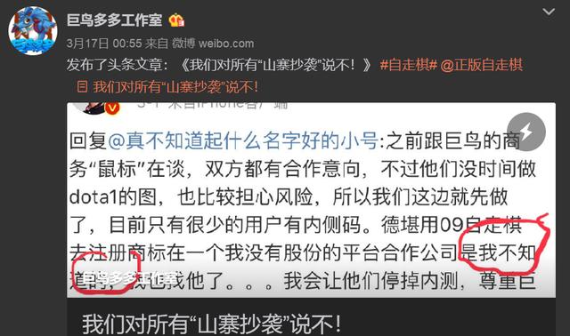 虽然没授权,巨鸟照样霸气,3月时候一个强硬公告,表示除了自己以外,其他所有自走棋游戏均属于山寨抄袭。以此想要独霸自走棋玩法,结果被毒奶色等一众游戏从业者怼得哑口无言,因为玩法本身没有版权一说(否则全天下RPG都是抄袭,FPS都是抄袭了),而自走棋玩法本身,都是借鉴War3地图《战三国》演变产生的。