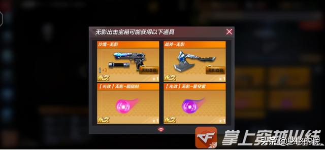 无影出击宝箱无影出击宝箱老活动赠送品了!出货概率在小编这里说实话一般,但又和机械迷城宝箱一样,中永久光效的概率比较大,就很迷!也不知道是我一个人还是大家都这样。不过无影出击宝箱里面可以拿到无影手枪和无影手斧,绝对非常值得攒,而且无影出击宝箱的放松力度也不小,还是很有盼头的!