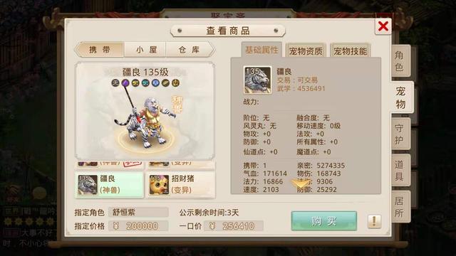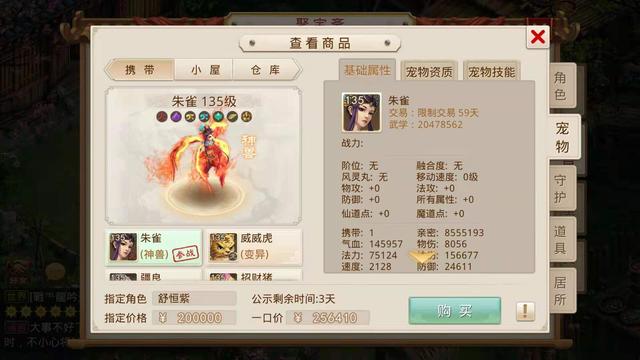 敏、力、法宠物都配了神兽,满足一切场景的需求,分别是法的朱雀、力的疆良和敏的九尾狐。疆良应该是刚买的或者换的,武学还没有继承只有450w,而朱雀有2000w武学、九尾狐有3700w武学,在全区也是名列前茅了想必。