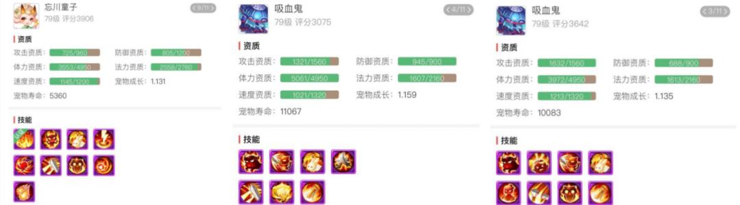 除了珍兽外,其他战宠也不容小觑。比如这只9技能隐攻吸血鬼,所拥有的1489的攻击资质、4558的体力资质已经接近于满属性,非常优秀!唯一美中不足的是1.146的成长略低一些,因此在技能配置方面不仅拥有高级强力、高级突进等技能来强化输出能力,同时还拥有高级感知、高级反震技能来提升站桩能力,在战斗中能打能抗,同时高级感知技能还能在玩家PK中发挥出亮眼的表现,是一只非常实用的隐攻吸血鬼。