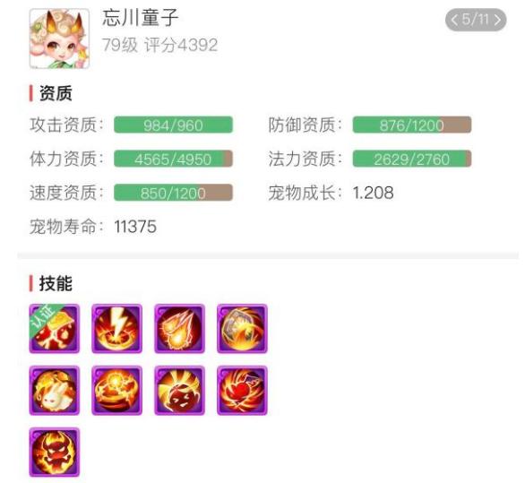 法宠方面还拥有一只出色的9技能单法忘川童子,资质同样不俗,其中法术资质高达2629,已经接近于满属性,同时还拥有1.208的高成长值,在技能方面搭配了高级法术连击、高级法术暴击、高级魔之心、高级魔之心技能来提升法术输出伤害,还搭配了高级反震和高级强壮来提升生存能力,同时拥有高级驱鬼技能,在面对难度任务时能够发挥不错的效果。除了这几只优秀的宠物外,角色上还有几只不错攻宠与法宠,宠物整体实力强大,无论是面对活动玩法还是PK都能够轻松的应对。