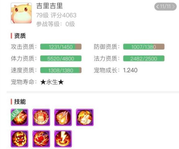 除了优秀的装备外,这个角色的宠物实力也同样出色。其中最引人注目的是一只7技能群法吉里吉里,这只吉里吉里的资质非常不错,其中2482的法术资质,1007的防御资质已经接近于满值,而5520的体力资质更是突破了上限,并且还拥有1.24的高成长值,属性简直无可挑剔。技能方面搭配了高级法术连击、高级法术暴击、高级魔之心技能来强化输出能力,并且有高级强壮、高级神佑复生技能来提升站桩能力,加上吉里吉里的专属技能效果,被物理攻击时有较大几率不受伤害,在战斗中表现非常强势。如此亮眼的吉里吉里在游戏中也是难得一见,售价将近万元左右。