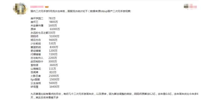 国内二次元手游一直是非常吃香的游戏,在吸金这块拿捏得死死的,最近就有B站UP主公布了二次元手游9月流水统计数据。其中《原神》在9月毫无疑问是最吸金的二次元游戏,流水达到了61000万元,其次为网易的《阴阳师》,流水为51000万元、《火影忍者》21000万。
