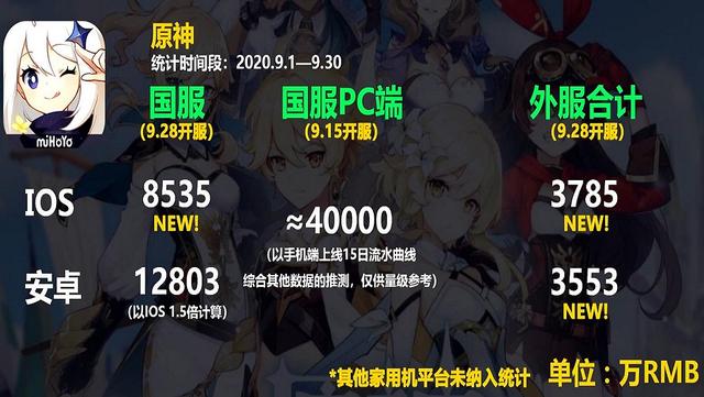 小y盲猜一波10月原神的流水应该不会下降太多,而且有保持增长的趋势。原因是该作在国内游戏畅销榜的TOP5,再加上各大主播都在直播氪金,这个游戏的吸引力对大家来说是非常大的,就算不想氪金的玩家都会下载体验一下。如果米哈游在10月开新池子及活动,那么流水增长的可能性就更大了。