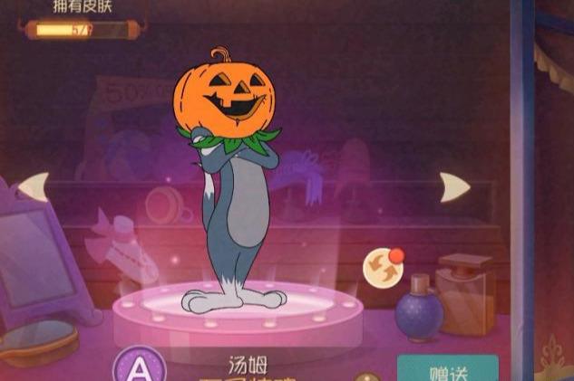 第一款万圣节皮肤就是大家这里看到的汤姆的皮肤,这款皮肤好像没有什么别的特效,就是汤姆加了一个南瓜头,而且这个南瓜头还在游戏中可以看到,就是雪夜古堡的彩蛋,好像就算这个南瓜头,而现在直接给汤姆带上了,然后呢?汤姆就加了一个南瓜头就是万圣节限定皮肤?涨知识了。