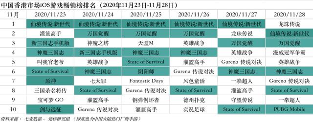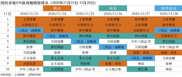 国内市场2020年11月23日—11月28日IOS游戏类畅销榜中,腾讯旗下产品依旧保持数量和排名优势。《王者荣耀》《和平精英》《天涯明月刀》三款手游长期霸占畅销榜T1梯队(前三名)。