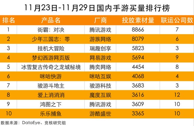 从整体大盘来看,11月23日—11月29日买量市场,腾讯新游《街霸:对决》与游族新游《少年三国志:零》“并驾齐驱”。