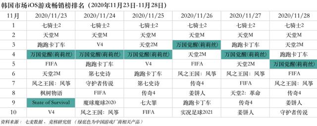 2020年2020年11月23日—11月28日韩国IOS游戏类畅销榜中,仅莉莉丝、FunPlus两家中国厂商旗下游戏上榜。