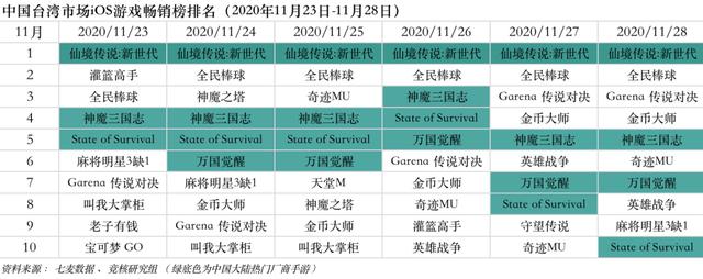 相比上周(11.16日—11.21),《使命召唤手游》最高排名由Top5升至Top2;《PUBG MOBILE》最高排名下滑至Top7;FunPlus《State of Survival》则掉出榜单之外。