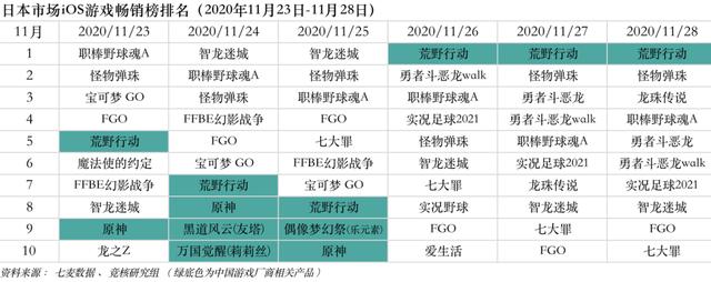 日本2020年2020年11月23日—11月28日IOS游戏类畅销榜中,网易、莉莉丝、米哈游、乐元素、米哈游、友塔等厂商产品进入Top10行列。