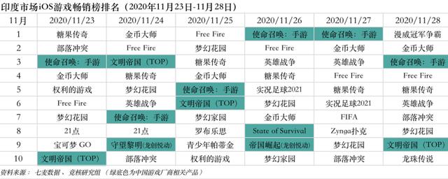 2020年2020年11月23日—11月28日印度IOS游戏类畅销榜中,腾讯、龙创悦动、TOP GAMES等厂商旗下手游进入Top10榜单。