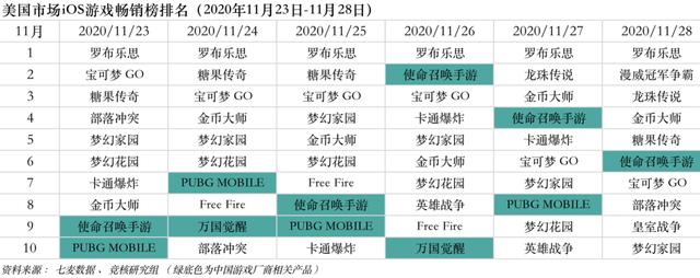 2020年2020年11月23日—11月28日美国IOS游戏类畅销榜中,腾讯旗下产品《PUBG MOBILE》《使命召唤手游》和莉莉丝旗下产品《万国觉醒》进入畅销榜单。