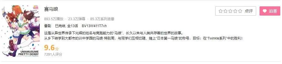 《赛马娘》的成功出圈,使其不仅在日本火热,国内用户对于这款动画同样追捧。在二次元玩家聚集的B站,接近900万次播放,9.6的评分,让《赛马娘》这一IP在国内也积累了大量的粉丝。