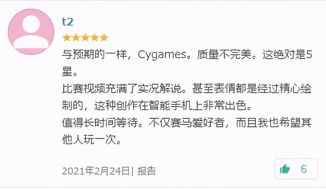 有玩家表示游戏质量虽然并不是那么完美,但对于比赛画面实况解说的设计,以及角色立绘方面可谓是相当的肯定,值得5星好评。