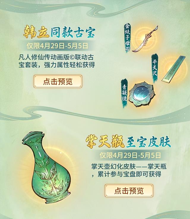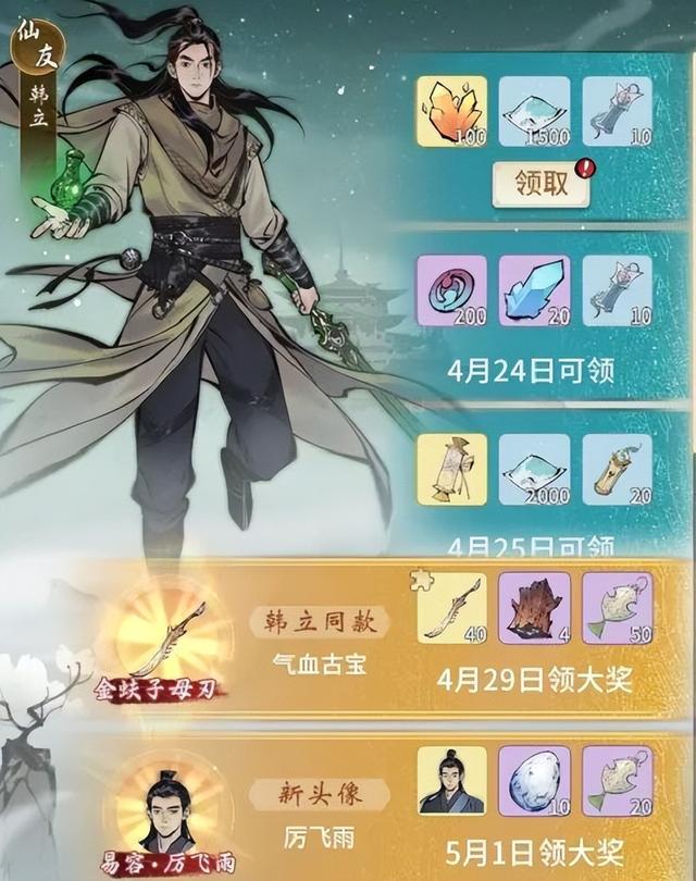 首先就是本次活动的开启时间,这次的联动活动在4月29日上线。仙友在游戏中可以获得新头像以及幻化套装,使用之后就可以变为韩立的模样。而且韩立也会与厉飞雨一同在游戏中作为npc出现,仙友到时候可以其交流,讨论一下修仙路上的各种经历。
