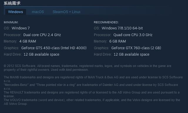 《欧洲卡车模拟2》于2012年10月18日,在PC端steam平台发售。游戏本体售价为108元,支持简体中文界面。感兴趣的小伙伴可以先下载免费的试玩demo,再决定是否购买游戏本体。游戏的电脑配置非常低,同时支持windows、MacOS、SteamOS,Linux系统。