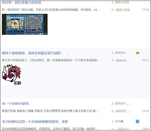同样有趣的还有百度“4399吧”里的人们。这里依然还算热闹,每天都有帖子更新。有人在寻找曾经玩过,却忘记名字的游戏;有人发现自己浏览器无法运行flash,像个小学生般急得焦头烂额;还有人,是为了寻找一起玩游戏的小伙伴,只为重温熟悉的快乐。