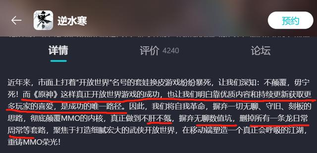 甚至,在游戏的TapTap介绍里,赫然写着要跟《原神》学习:“只有原神这样真正开放世界游戏,凭借优质的内容和扎实更新,来吸引更多玩家,才是成功的唯一路径。”这也是网易这个老牌游戏大厂第一次公开高度赞扬米哈游的原神。