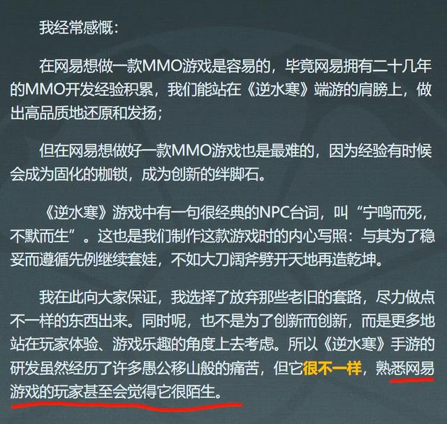 而在开发者的话中,他们指出团队的开发目标则是制作一款“不肝不氪”、“身份玩法自由选择”、“神功装备探索产出”、“无一条龙和课程表”、“不强迫社交”、“可当单机开放世界玩”的颠覆性武侠手游,因此,玩家会觉得这款游戏“很不网易”。