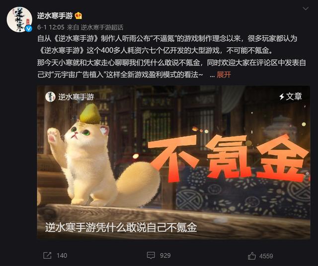 活久见,在玩家多年以来“太氪了”的吐槽声中,网易出品的新游戏《逆水寒》手游官方竟然公开宣布:“不氪金”。