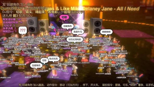 在这里,每个观众只需要输入“创建角色”就能在舞池中拥有一只属于自己的小狗,再靠类似“薯条”、“玩手机”、“开火车”等指令控制小狗在舞池中随性装扮与舞蹈。