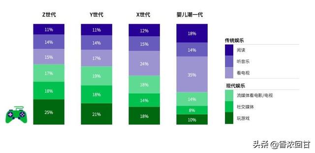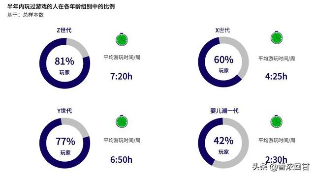 年轻一辈的「Z世代」有81%的人在玩游戏,虽然玩游戏的比例随着年龄增长而减少,但即使是婴儿潮世代的长辈们,仍有近半数、42%的人会玩游戏,只是每周的游戏时间,和Z世代的7小时20分钟相比少了许多,仅2个半小时、占比10%。这是因为婴儿潮世代更喜欢收看电视、阅读及听音乐等休闲活动。