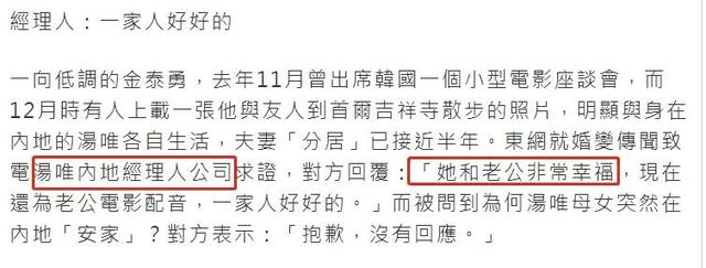 2022年2月10日,港媒称汤唯与金泰勇已经分居半年之久,疑似婚变。