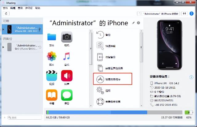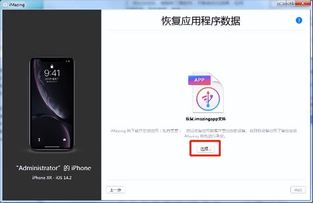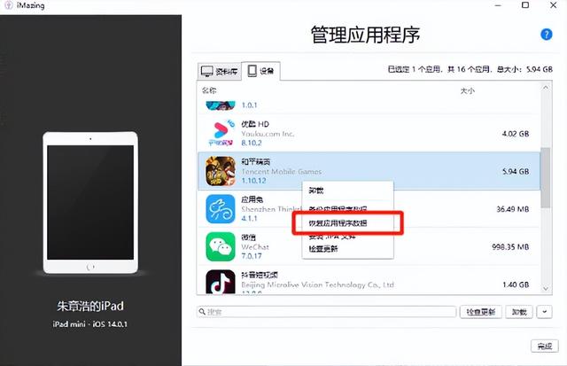 双击imazing图标运行,弹窗请点击【试用】,点击【稍后】,选择【管理应用程序】,选择【设备】,下拉找到游戏【和平精英】右键【和平精英】,选择【恢复应用程序数据】